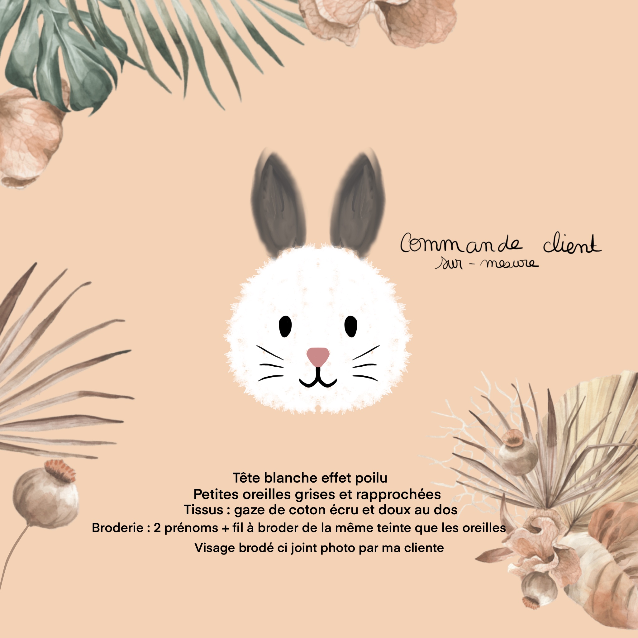 Commande client – doudou noeud lapin tête blanche et oreilles grises + broderie